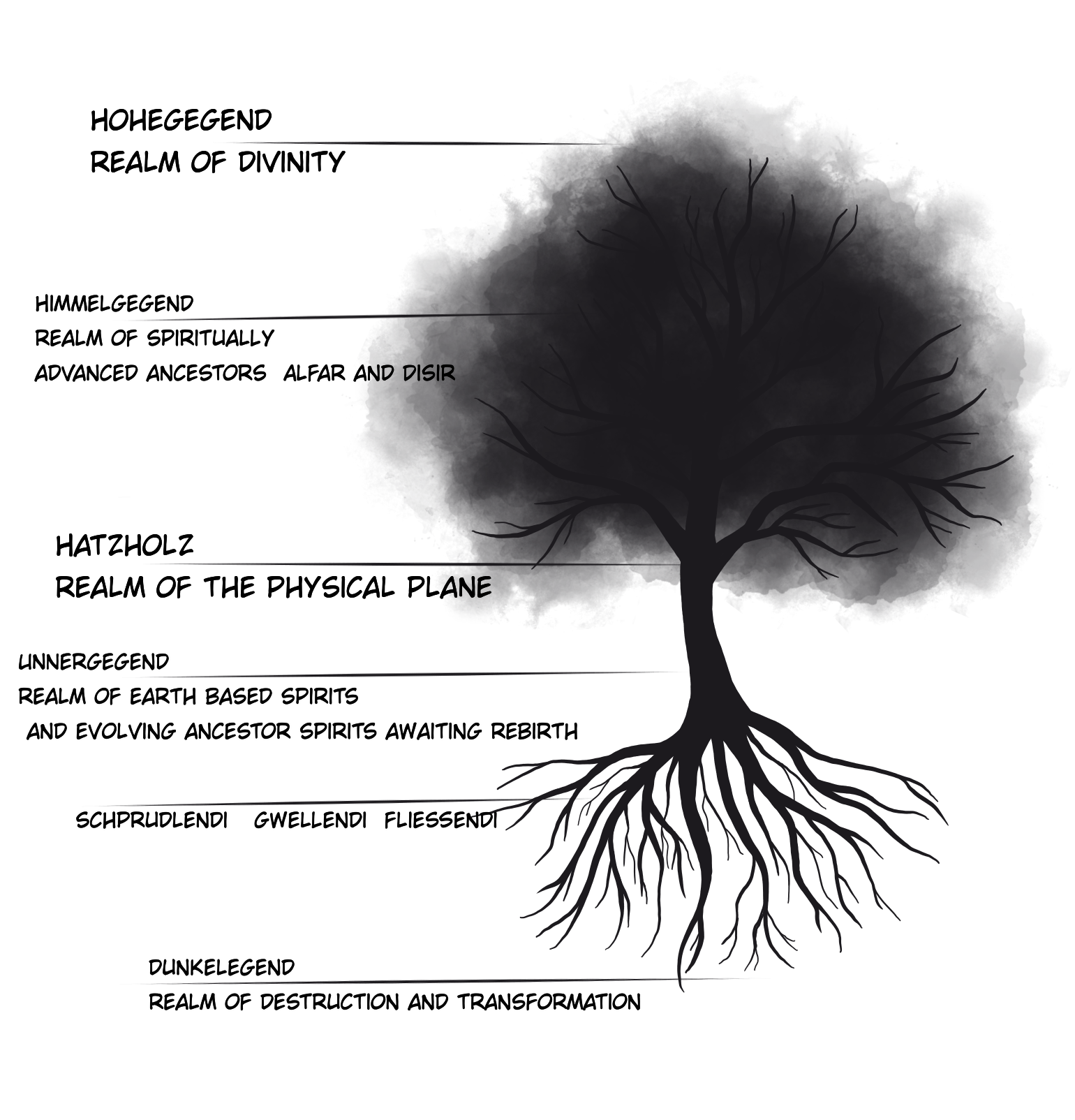 The different realms for the World Tree above come from the Urglaawe tradition. You can read all about it in a great book I highly recommend. Heathen Traditions of the Pennsylvania Dutch: An Urglaawe Primer, link below.